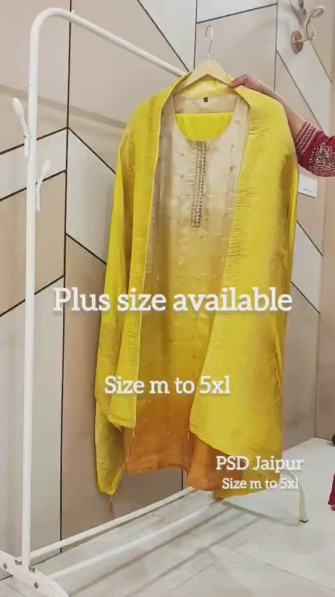 Ombre Suit"Ombre allure! 🌟 This Pure Tissue Shimmer Kurta shines with all-over sequence work, potli buttons on slits and sleeves, and comfy cotton lining. Paired with flowy plazzo and stunning Banarasi dupatta. Perfect for twirling into the festive season!
