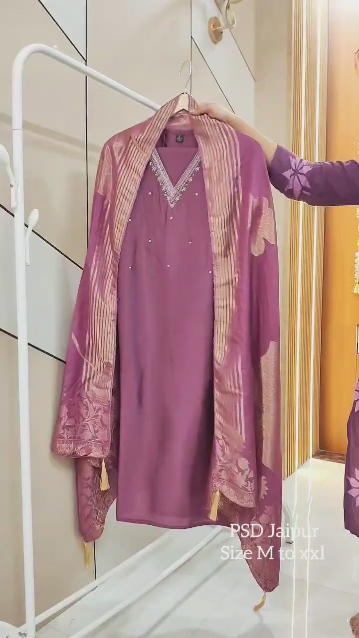 Purple Soft Roman SuitThis Soft Roman Suit features stunning handwork on the neckline (lining inside), paired with comfy pants and a luxurious Banarasi Silk Dupatta. Perfect for a touch of elegance!
