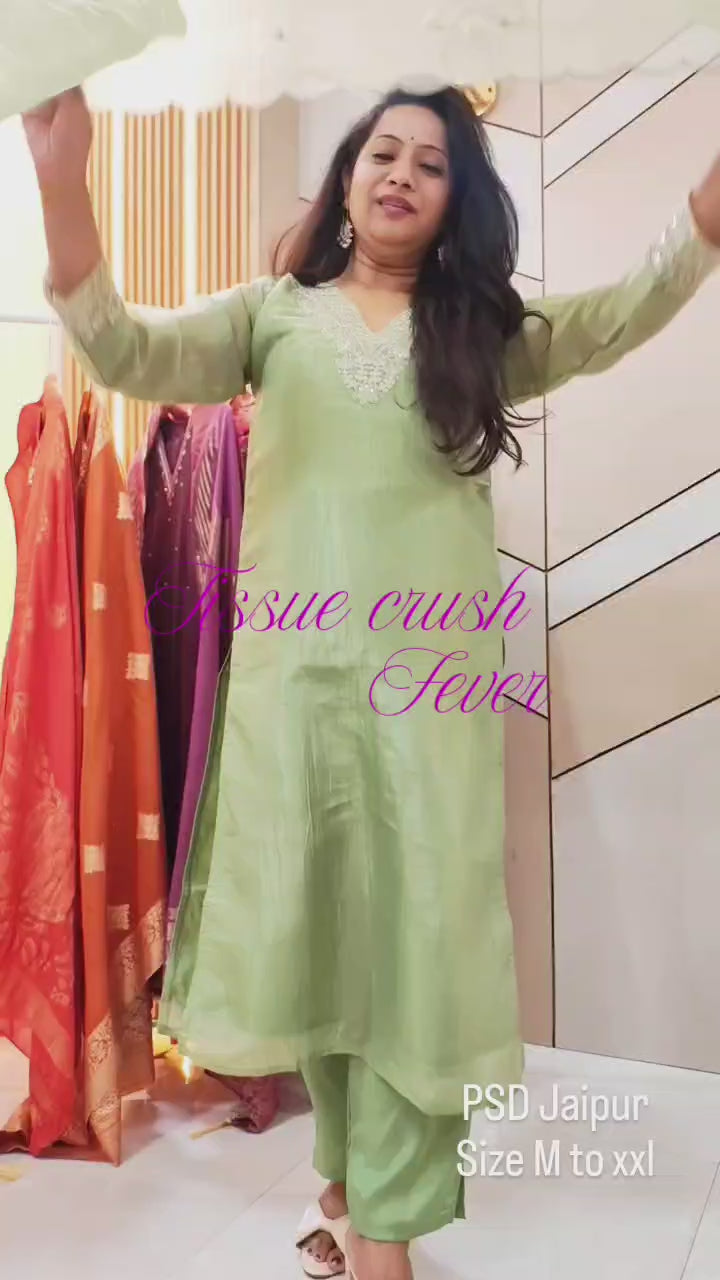 Green Tissue Crush suitThis Tissue Crush Kurta features beautiful zari embroidery on the neckline, paired with comfy lining, pants, and an Organza Dupatta with scalping zari embroidery. Perfect for a chic look!
