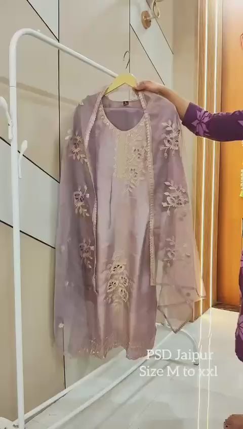 Lavender Cut work suitGlamour personified! ✨ This Tissue Shimmer Kurta boasts stunning cutwork, zari, and thread embroidery, paired with comfy lining, pants, and a show-stopping Organza Dupatta featuring cutwork and zari embroidery.