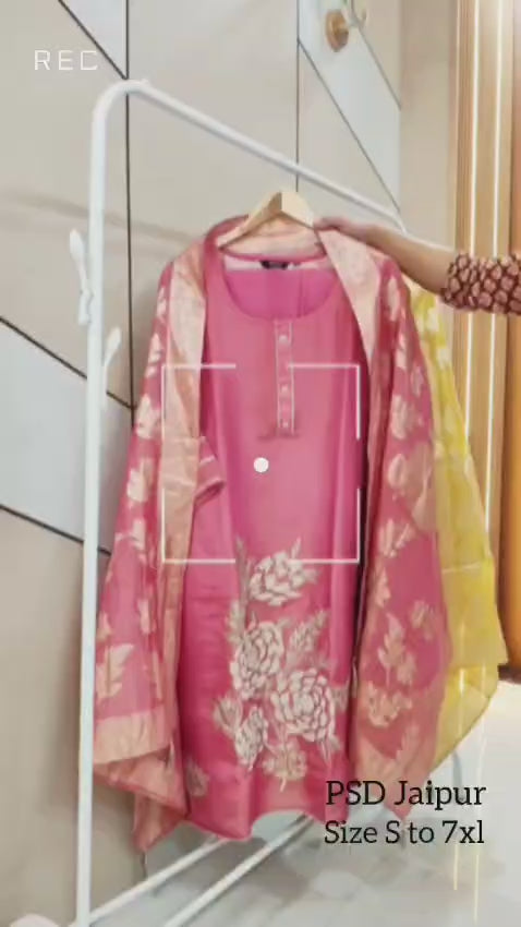 Premium brocade kurta with beautiful yoke zari sequence embroidery and applique work(lining inside),comfortable pants and printed zari embroidery dupatta