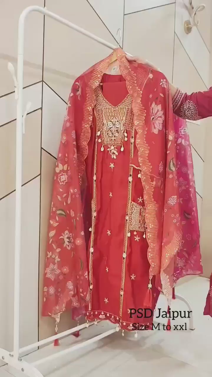 Roman Glass SuitBeautiful Roman Glass Shine Fabric kurta having heavy hand work(lining inside) , comfortable pant and printed Organza Dupatta