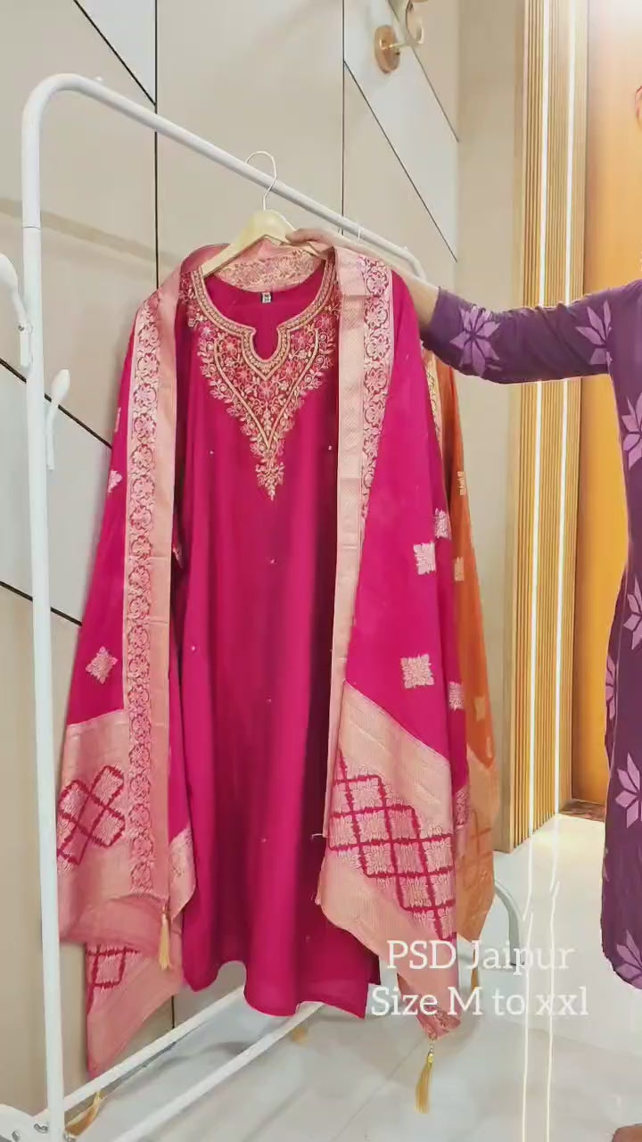 Hot Pink Silk suitPure Soft Silk top having Zari embroidery On neck and daman, comfortable pant and banarasi silk Dupatta