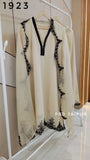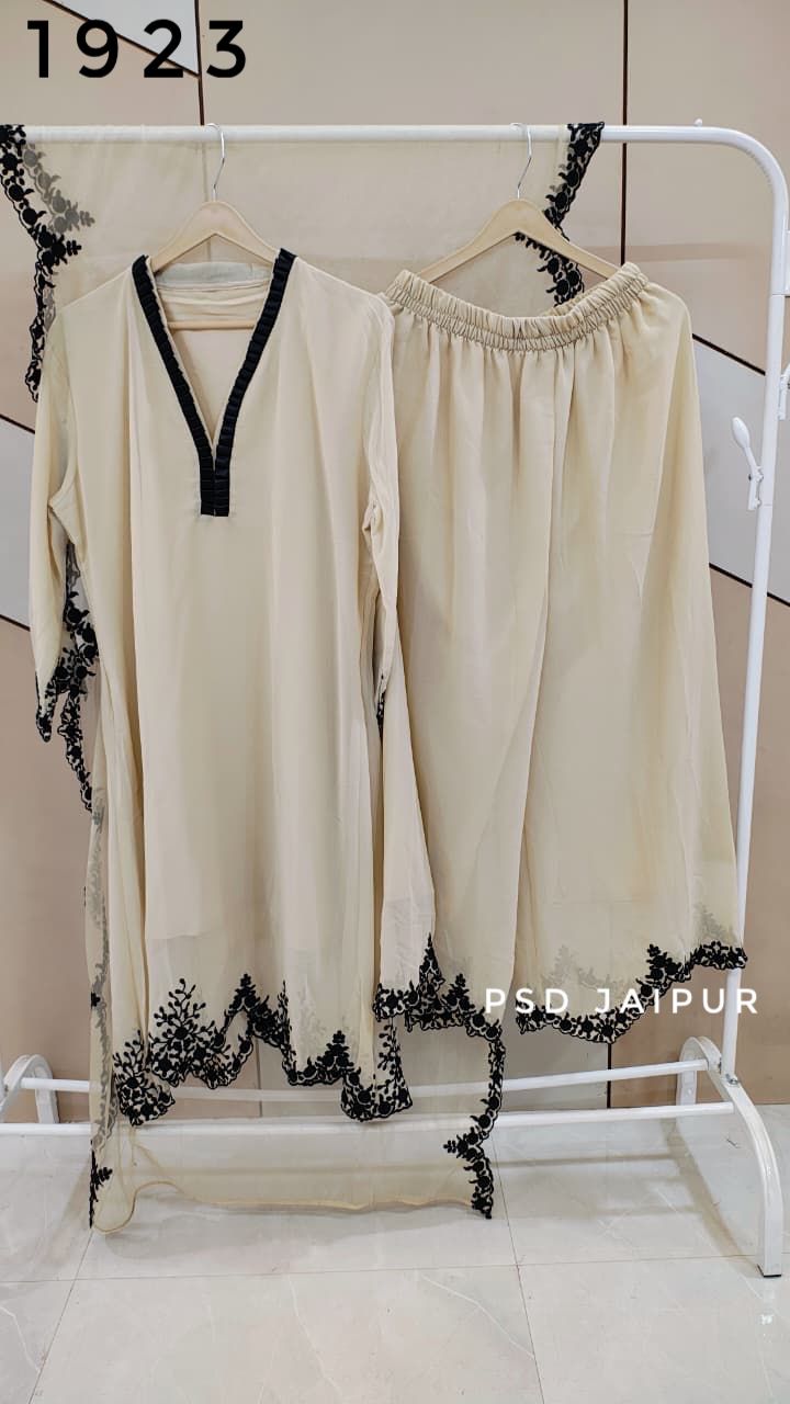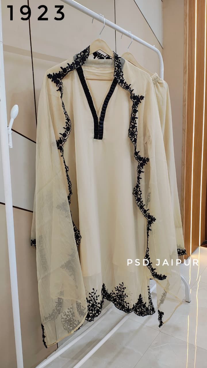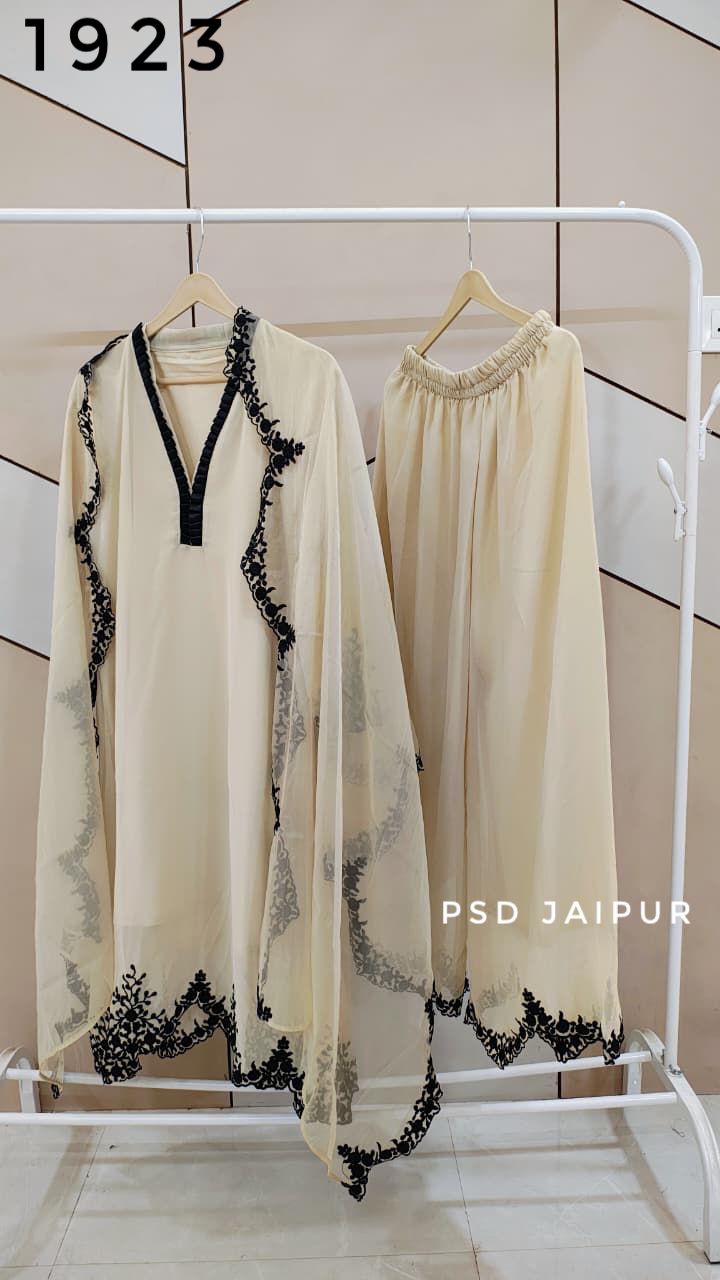 Georgette Short A-line Kurta having beautiful pleated neckline and designer embroidery Scalping sleeves, Straightfit Plazzo having cut work and embroidery and tissue shimmer dupatta with scalping and embroidery (lining in both top and bottom)