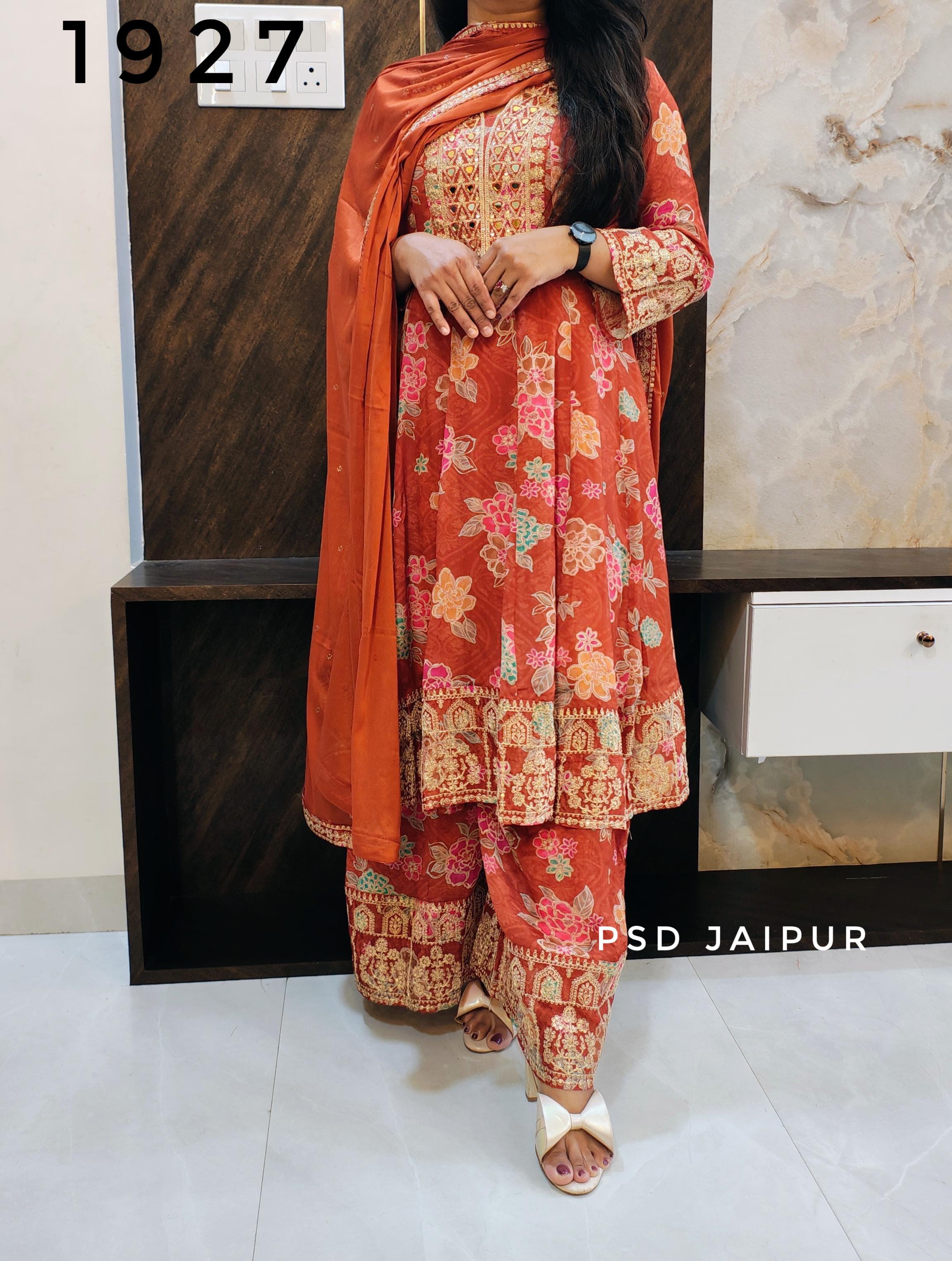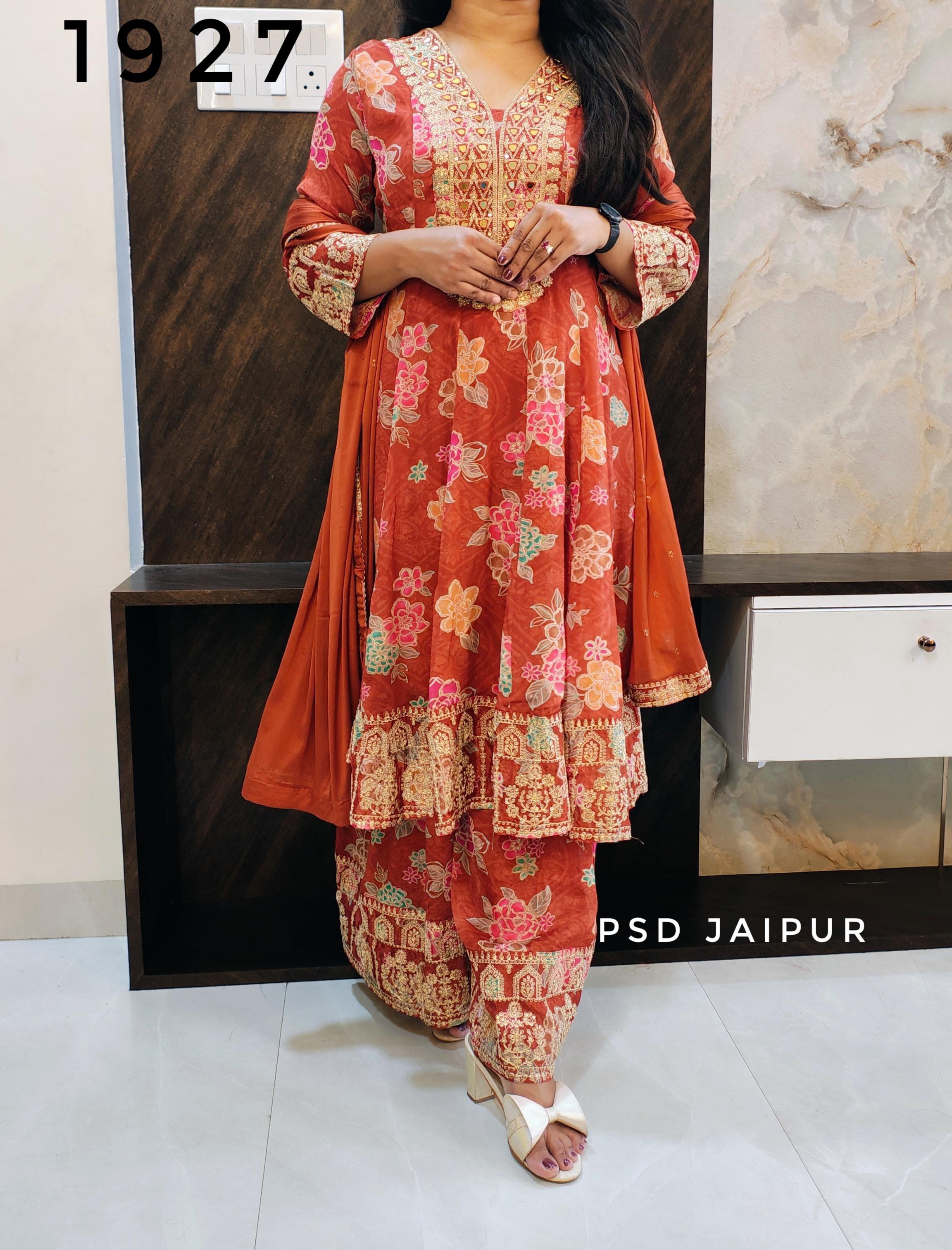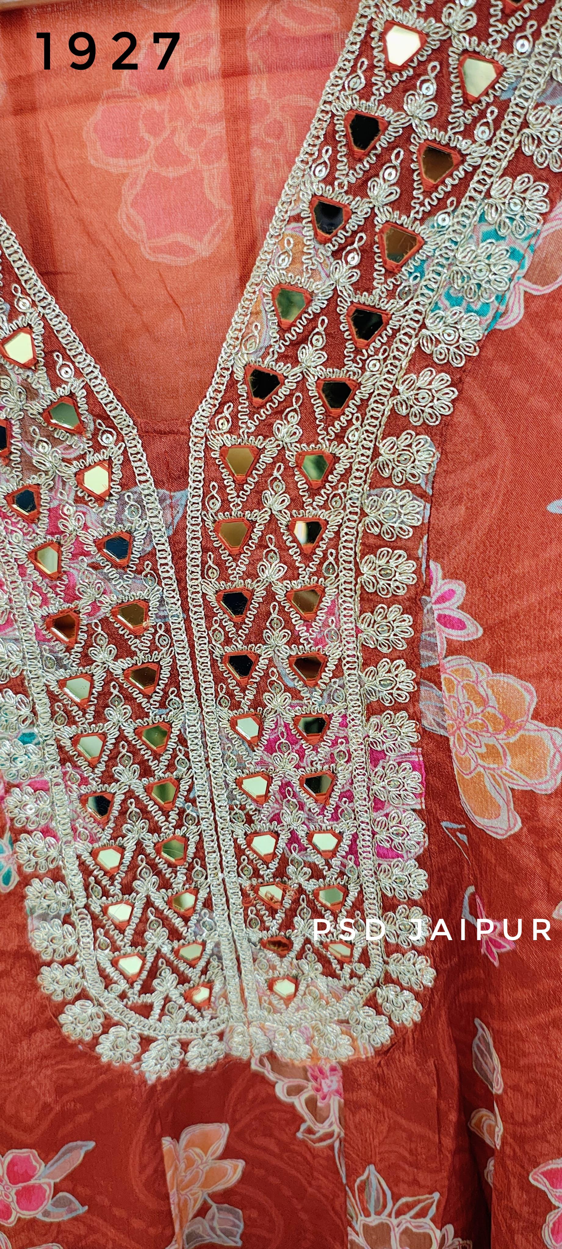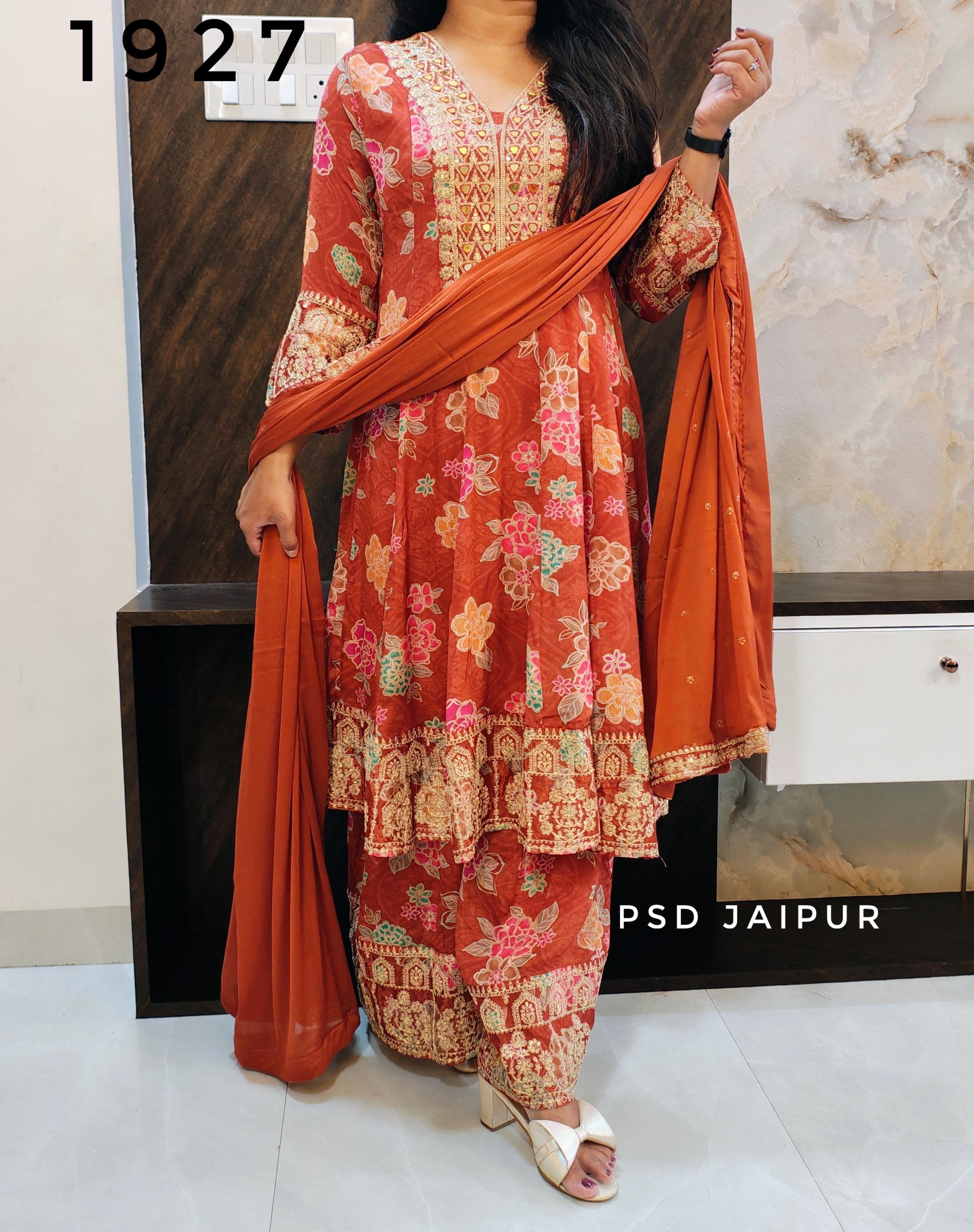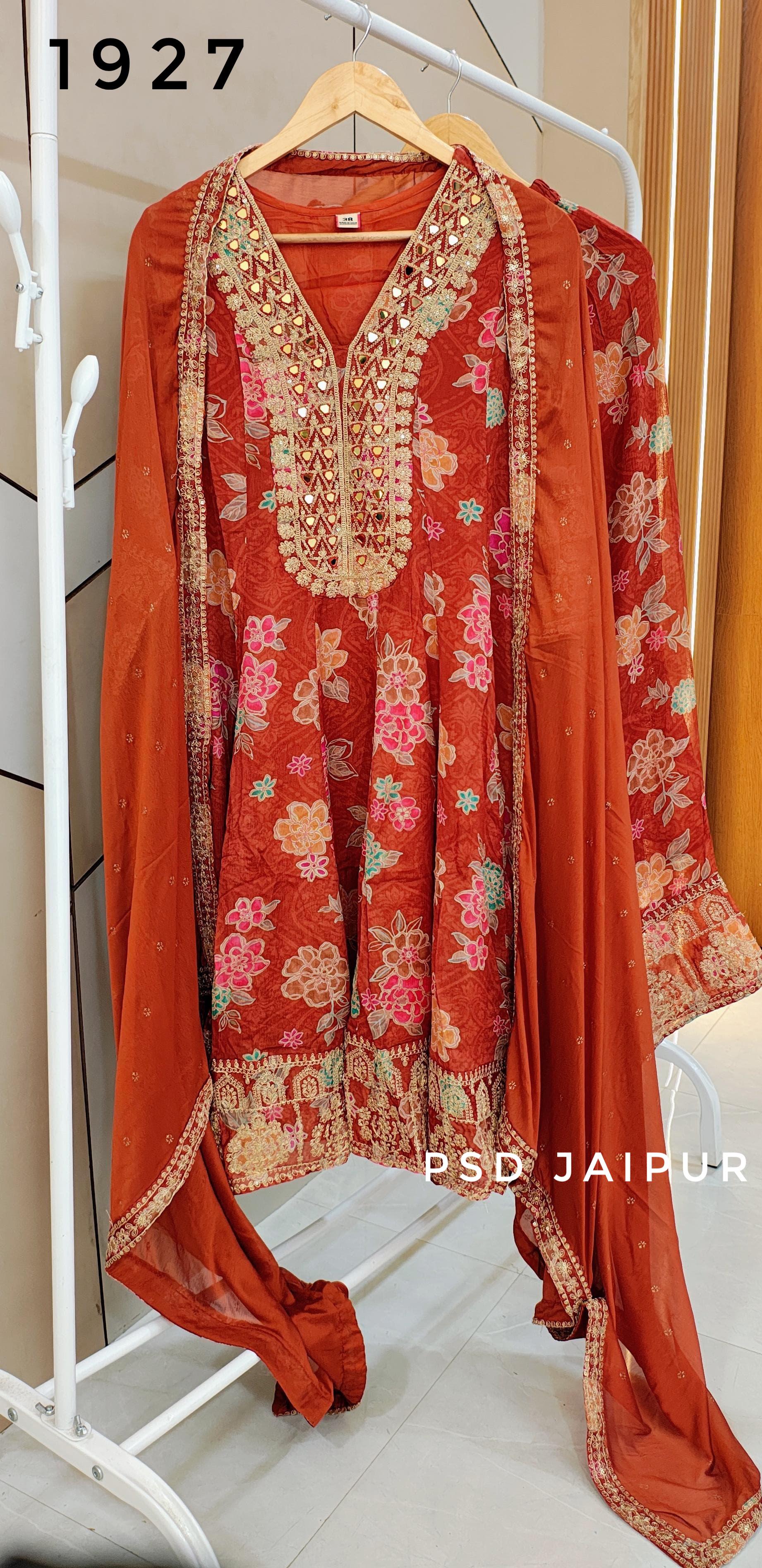 Premium Printed Pure Chinon Short Frock Suit having Zari embroidery and mirror work on neck line (lining inside) Flared Plazzo and Chiffon Dupatta